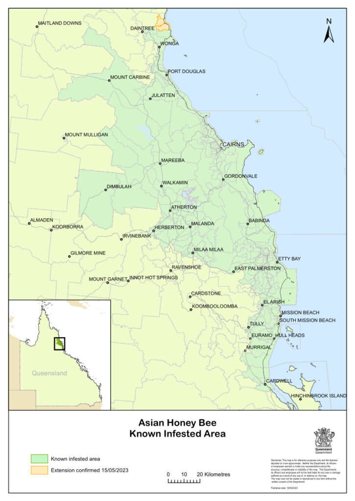 “There are currently restrictions on the movement of bees, bee hives, bee products (excluding honey), and used bee keeping equipment from the Townsville area to prevent any possible spread of the mite.”